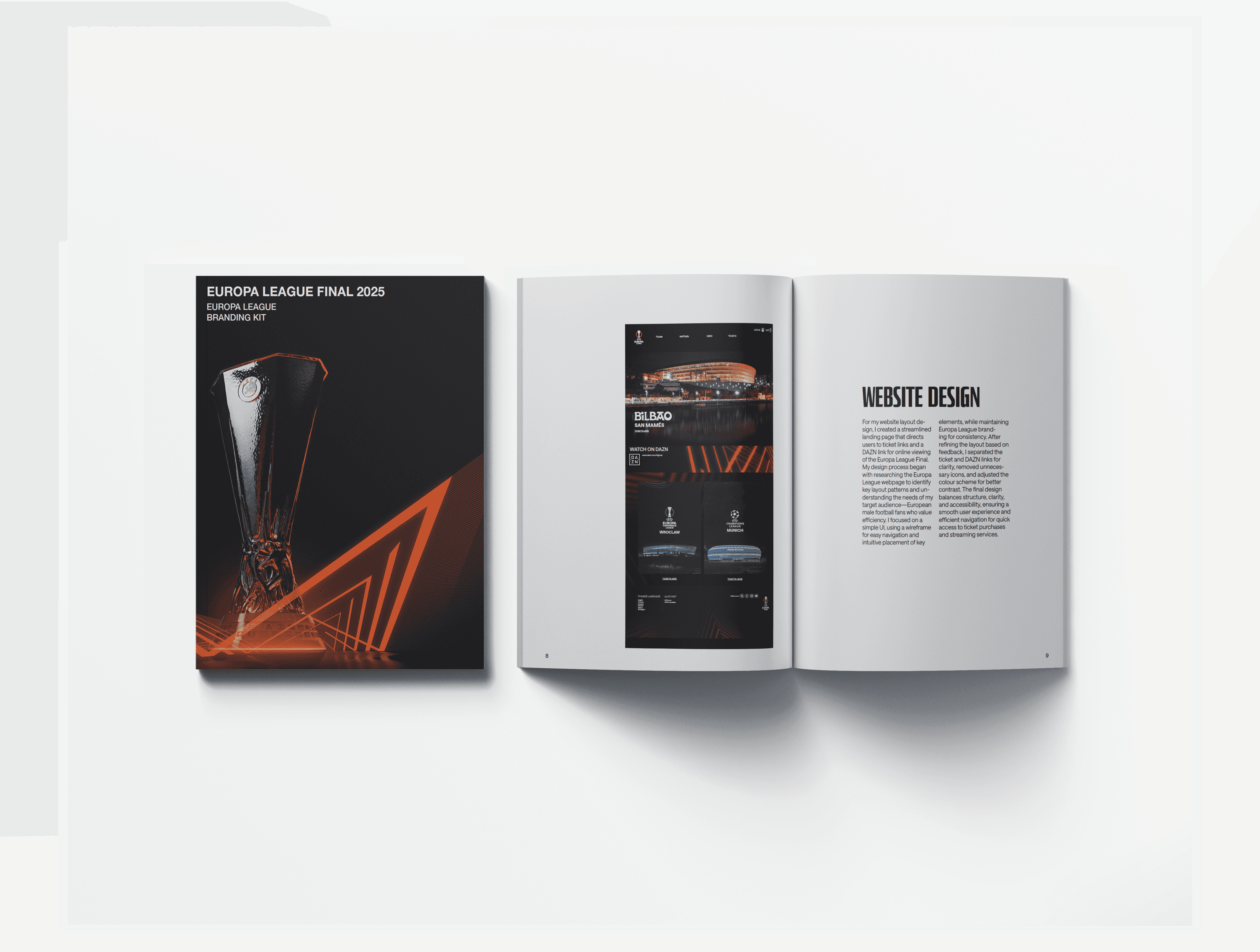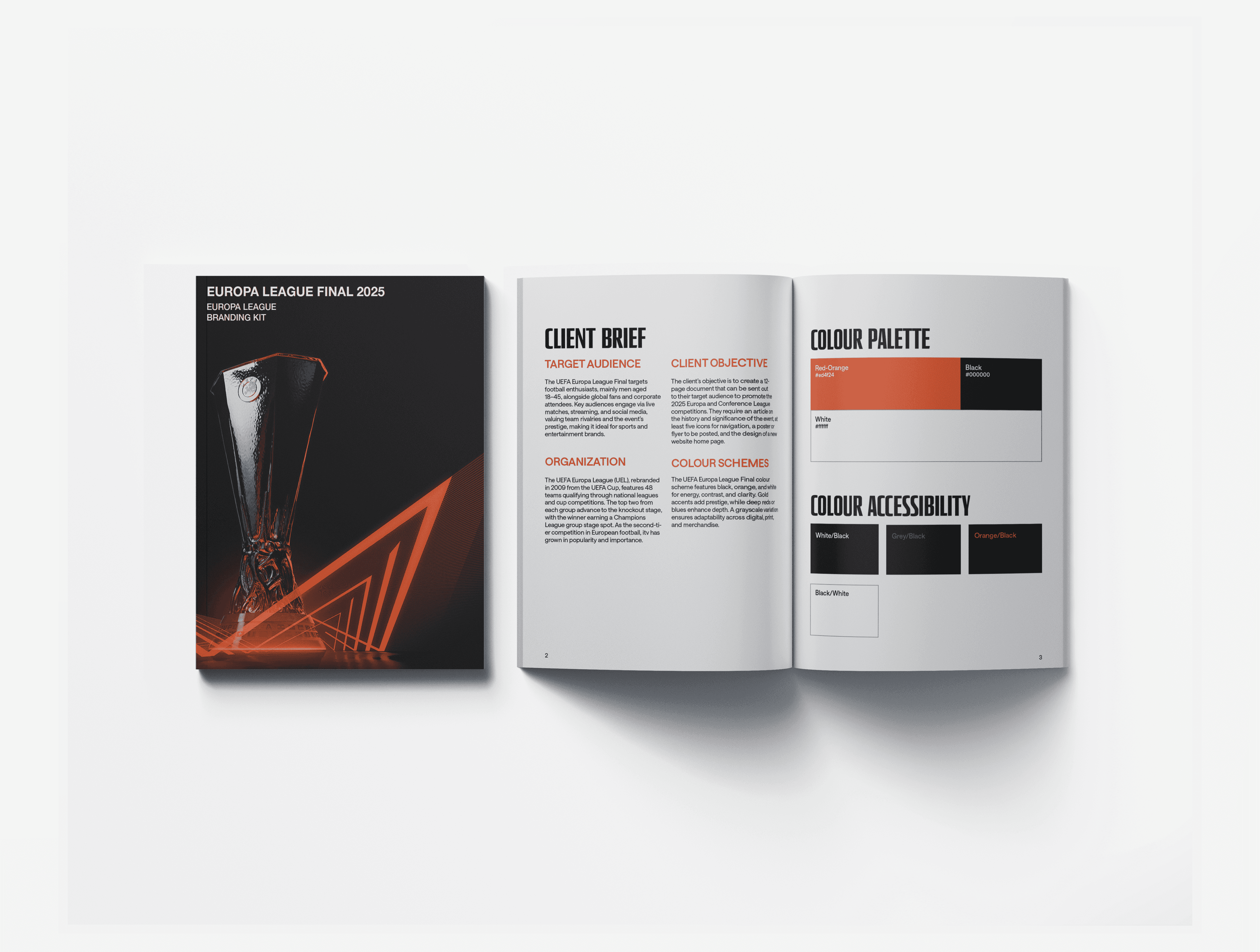 The client’s objective was to create a 12-page document to send to their target audience to promote the 2025 Europa and Conference League competitions. They require an article on the event's history and significance, at least five icons, a poster or flyer to be posted, and the design of a new website homepage.